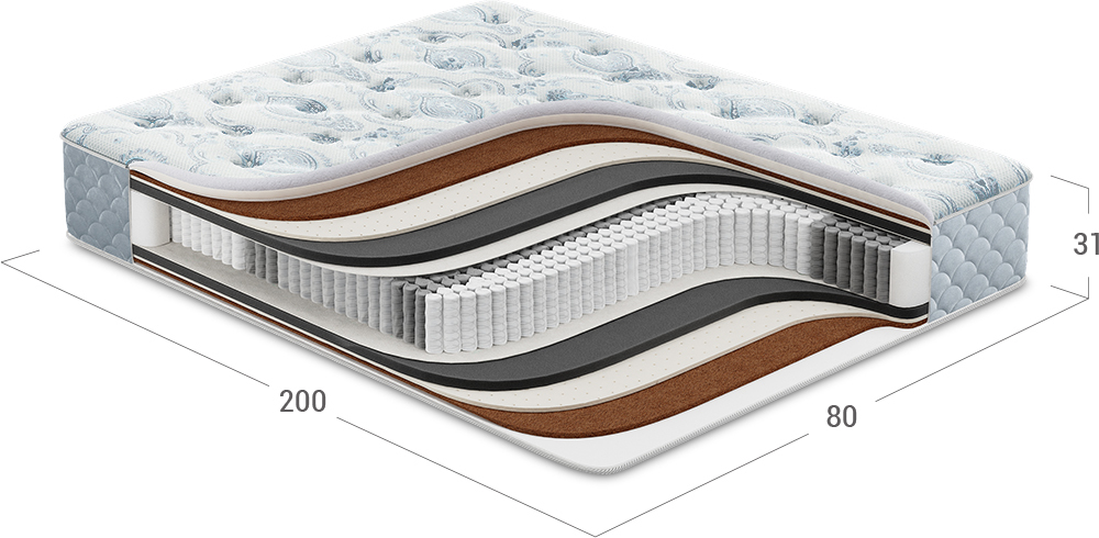 Для комплектации Comfort используется НПБ 1058 пружин на спальное место с 7-зональной поддержкой. Формируется 7 зон поддержки: голова, плечи, поясница, таз, бедра, голени, стопы. Зональная поддержка помогает принять анатомически правильное положение во время сна, за счет чего снимается мышечное напряжение спины и происходит расслабление тела.