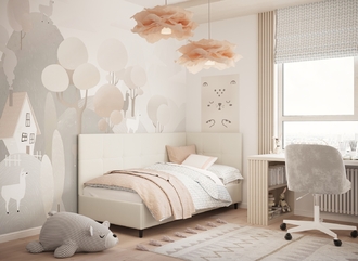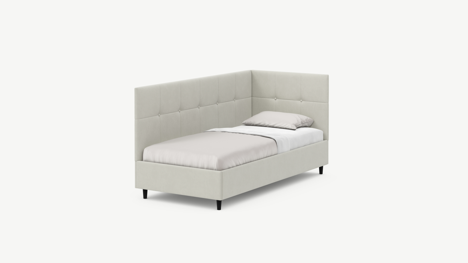Угловая односпальная кровать MOON FAMILY 1261 с мягкой спинкой и изголовьем создаст в Вашей спальне ощущение уюта. Крупная квадратная стежка привносит в интерьер графических акцентов, а вставка из пуговиц наполняет пространство ощущением домашнего тепла.