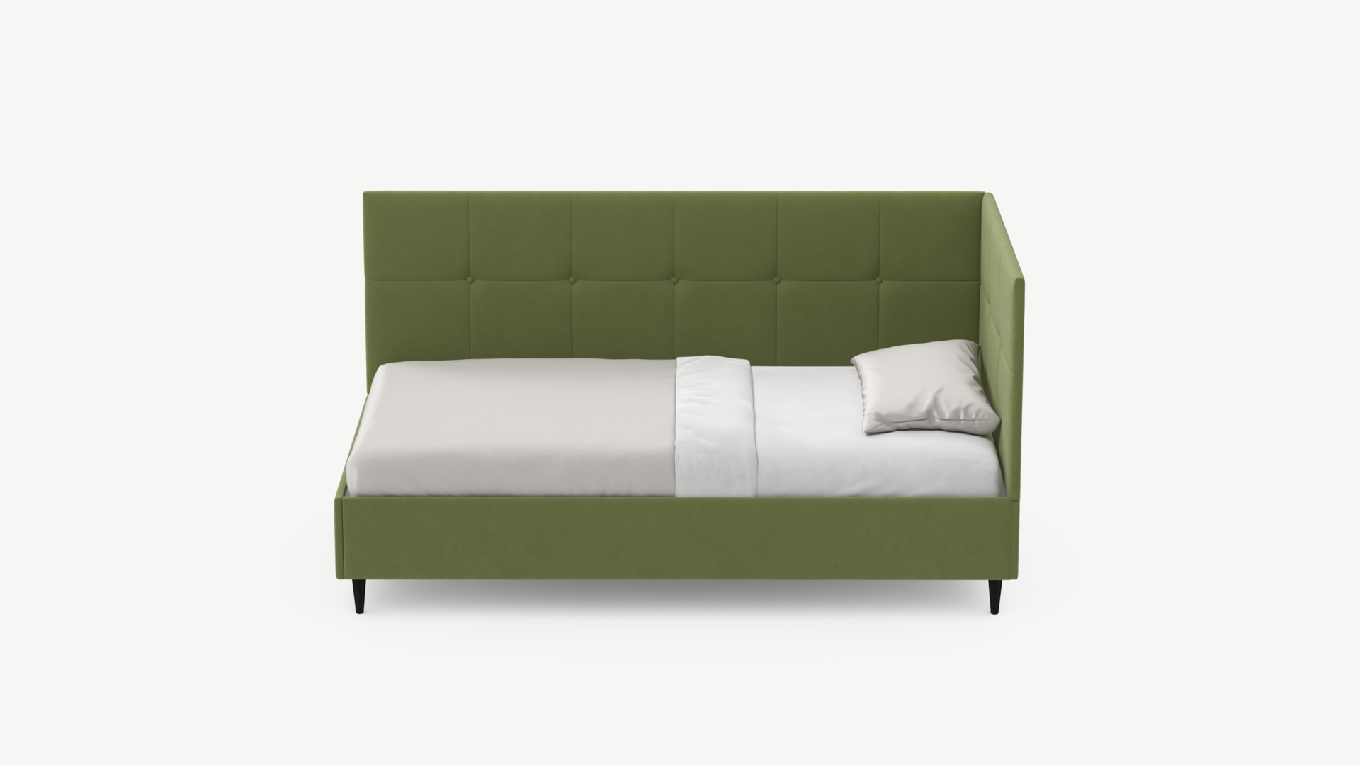 Угловая односпальная кровать MOON FAMILY 1261 с мягкой спинкой и изголовьем создаст в Вашей спальне ощущение уюта. Крупная квадратная стежка привносит в интерьер графических акцентов, а вставка из пуговиц наполняет пространство ощущением домашнего тепла.