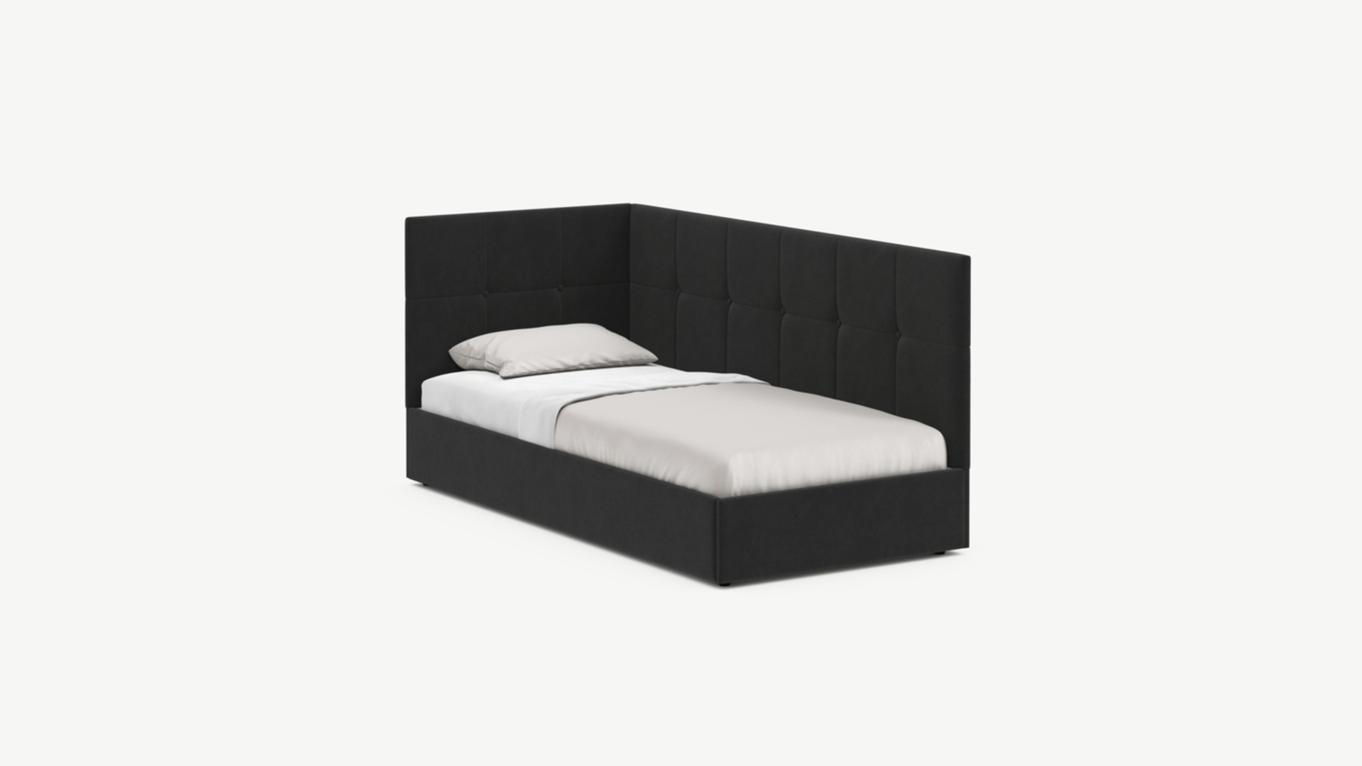 Угловая односпальная кровать MOON FAMILY 1261 с мягкой спинкой и изголовьем создаст в Вашей спальне ощущение уюта. Крупная квадратная стежка привносит в интерьер графических акцентов, а вставка из пуговиц наполняет пространство ощущением домашнего тепла.