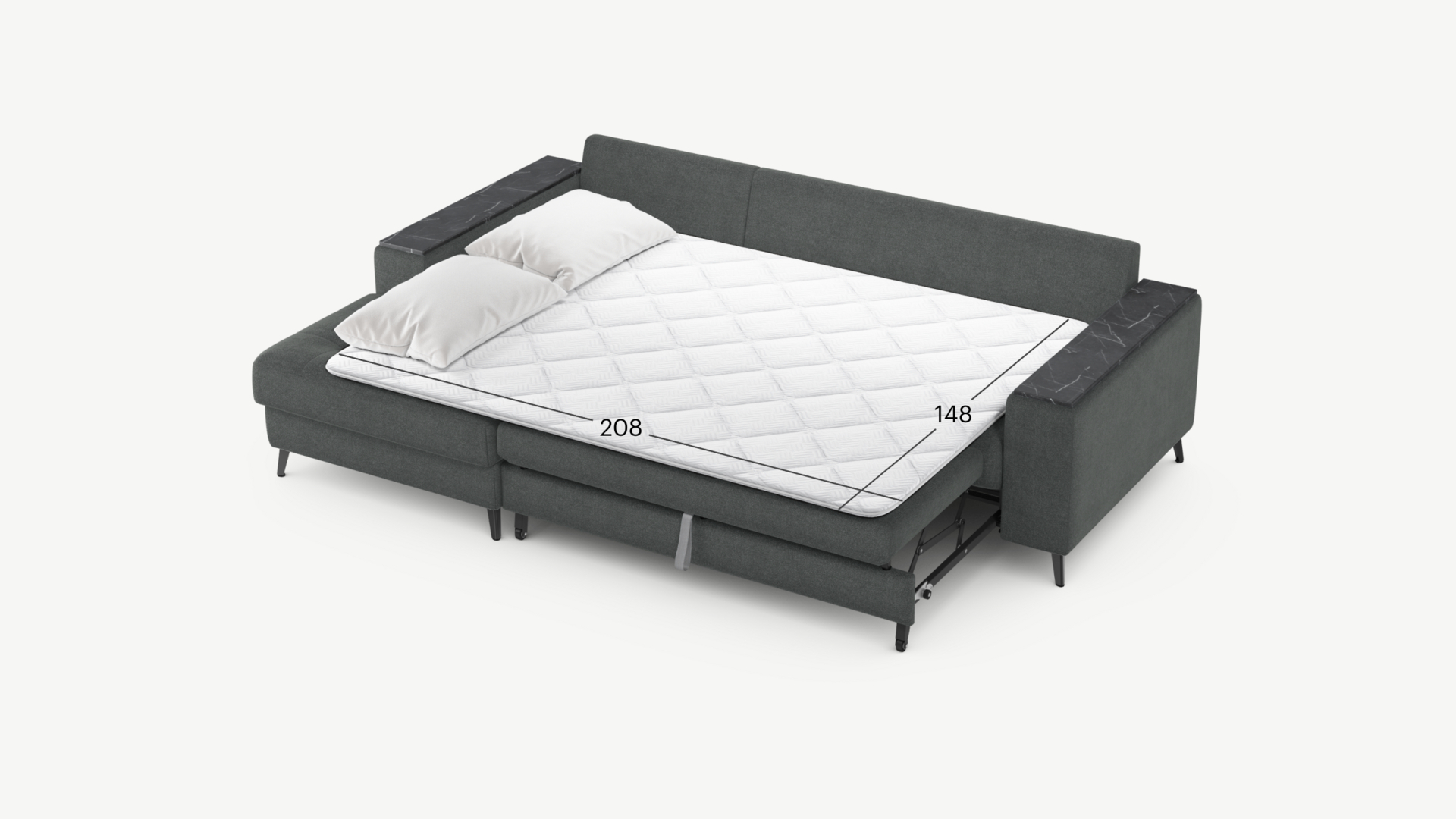 Секция «канапе» обеспечивает дополнительное пространство для отдыха, благодаря которому Вы можете располагаться с максимальным комфортом, удобно вытянув ноги. Под данной секцией расположен вместительный бельевой короб.